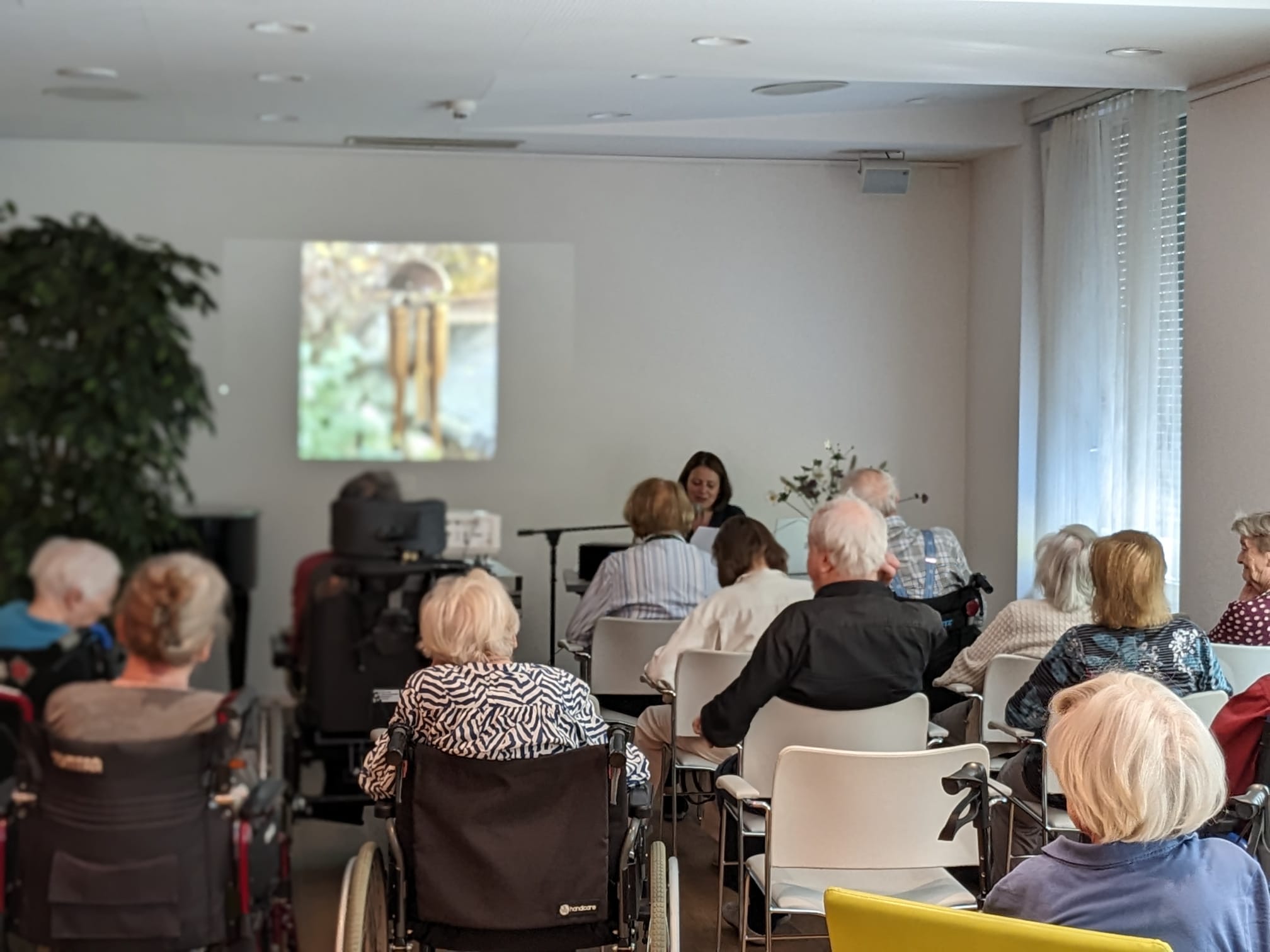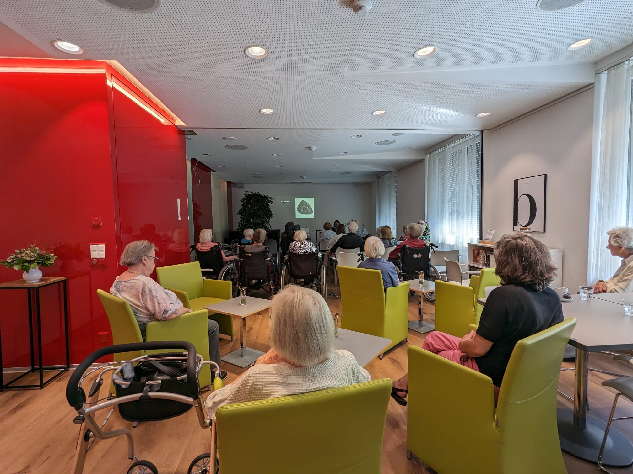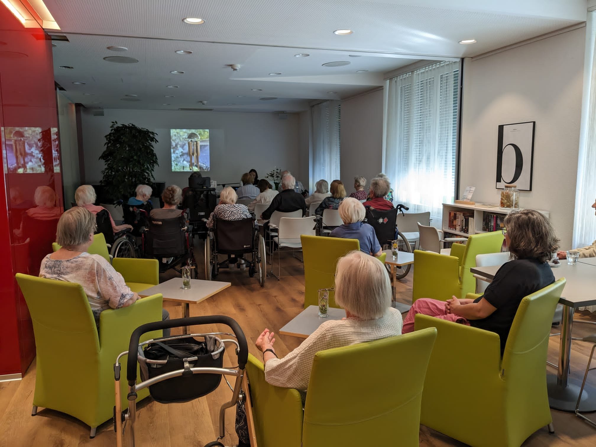 Trotz schönem Wetter versammelten sich viele Bewohner:innen für den Kurzgeschichten-Nachmittag im Saal. Es wurden ausgewählte Geschichten vom Schweizer Schriftsteller Peter Bichsel vorgelesen.