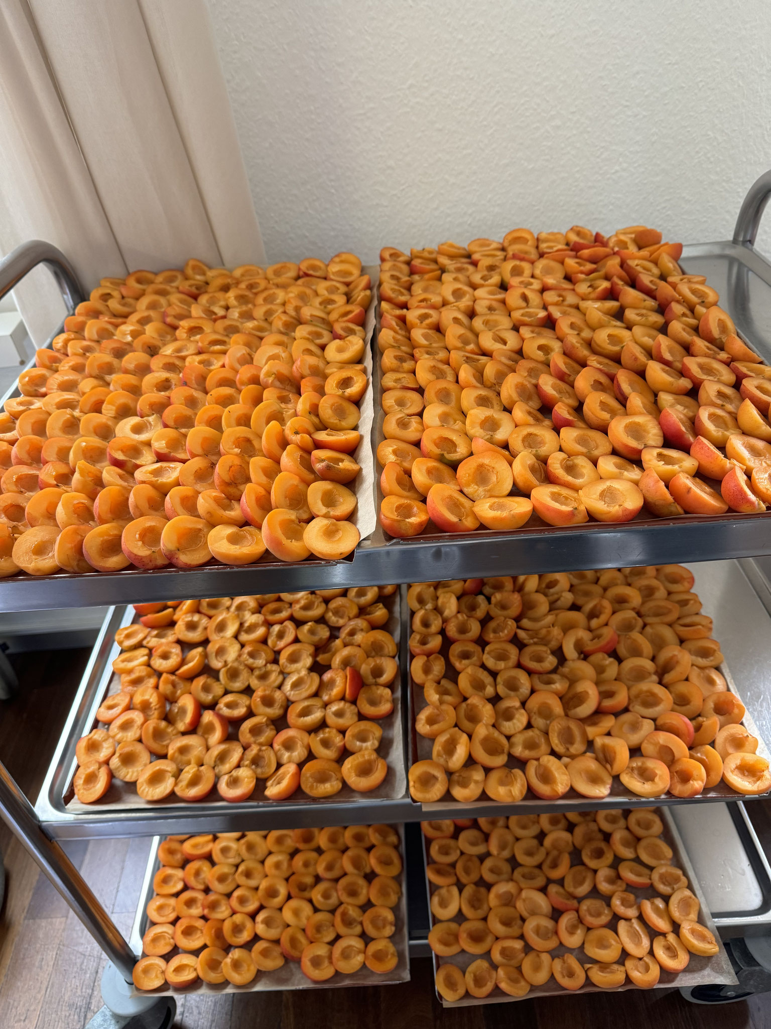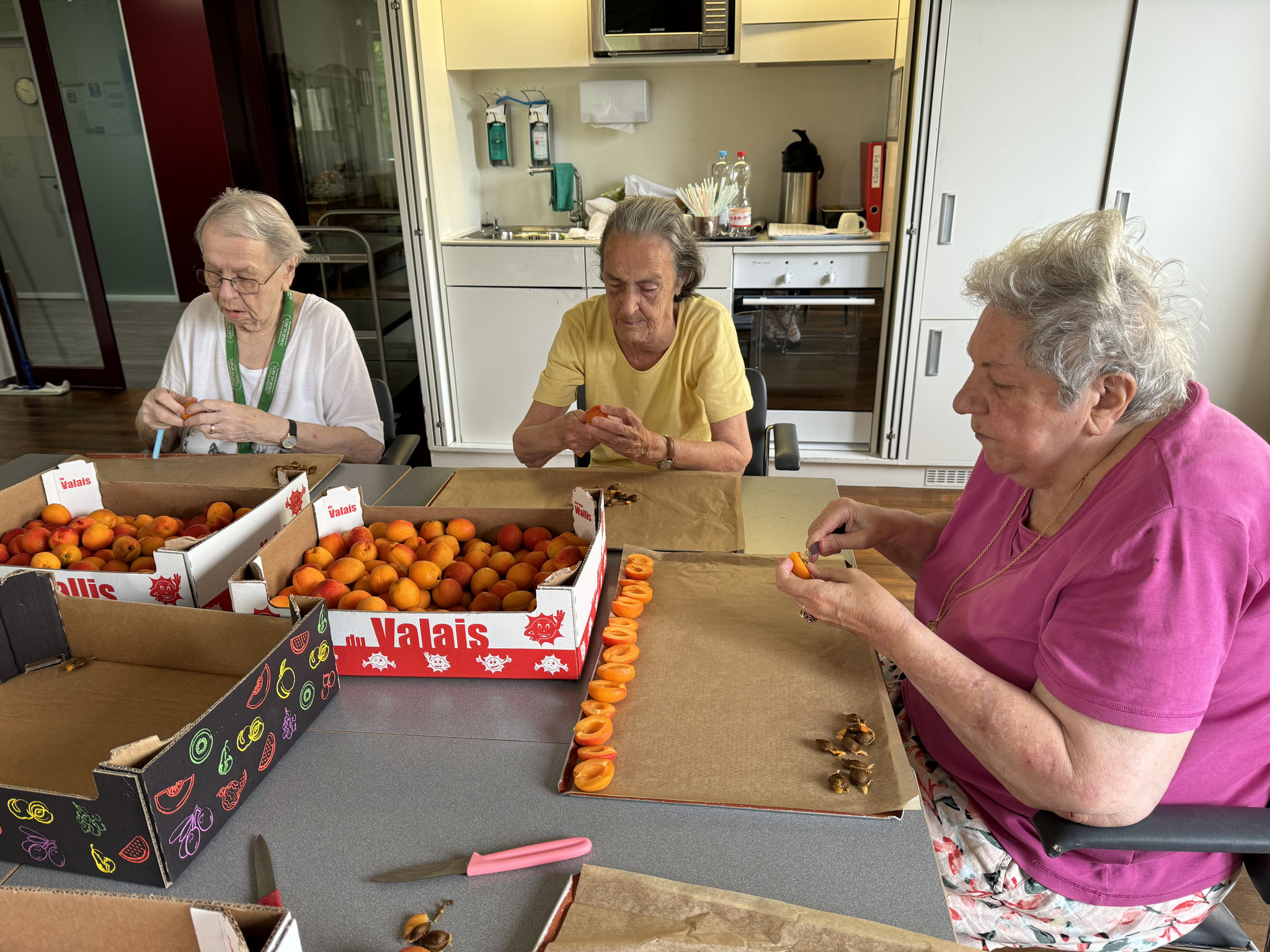 Heute wurden Aprikosen anstatt Äpfel gerüstet. Die leckeren Walliser Aprikosen wurden von unseren Bewohnerinnen und Bewohner halbiert, entsteint und auf den Blechen ordentlich aufgereiht. Was zaubert die Küche wohl aus den fein duftenden Früchten?